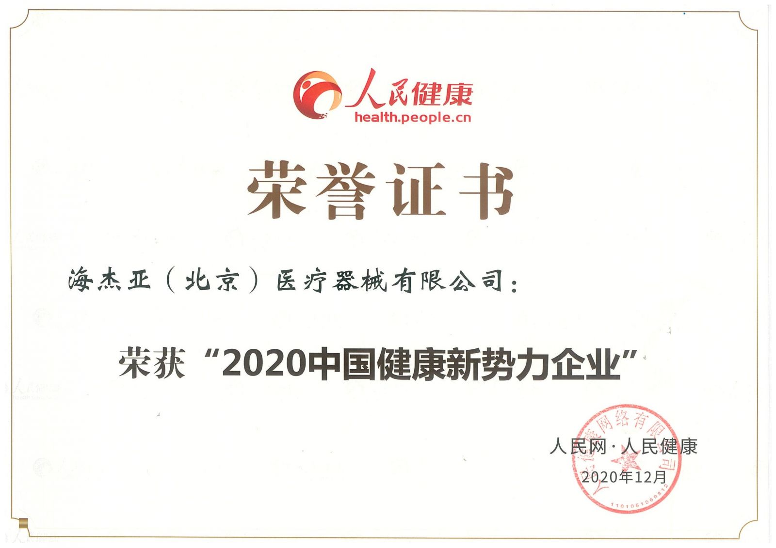 會(huì)議公布了2020中國健康新勢力企業(yè)征集活動(dòng)結(jié)果,海杰亞榮獲“2020中國健康新勢力企業(yè)”。