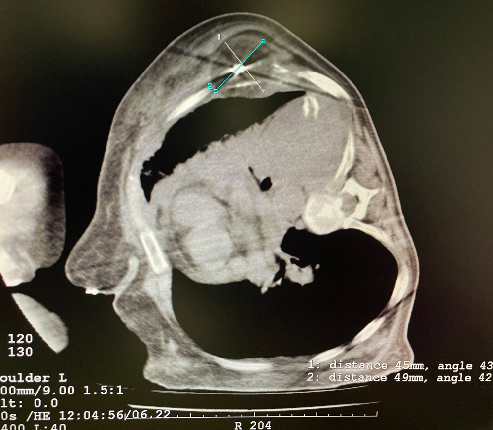 女,42歲,復(fù)發(fā)性脂肪瘤,病灶位于右側(cè)膝關(guān)節(jié),直徑大小13cm。采用雙針方案,共進(jìn)行6個凍融循環(huán),最大冰球直徑達(dá)8.2cm,術(shù)中多方位治療全面覆蓋病灶范圍。患者術(shù)后狀況良好。
